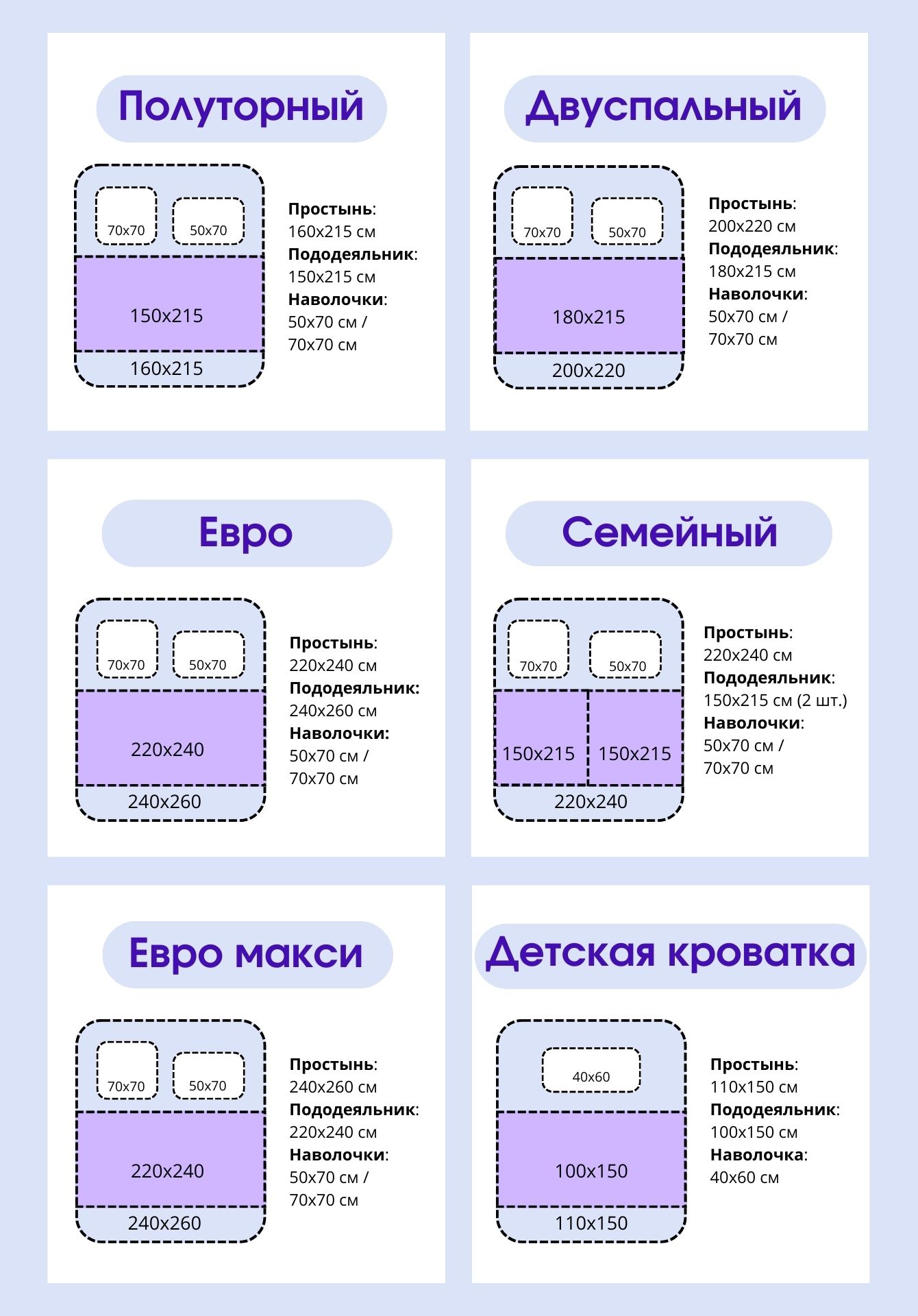 Постельное белье представлено в различных размерах, которые предназначены для разных типов кроватей и спальных мест. Каждый из них обладает своими особенностями, и выбор подходящего зависит от ваших предпочтений и параметров спального места.